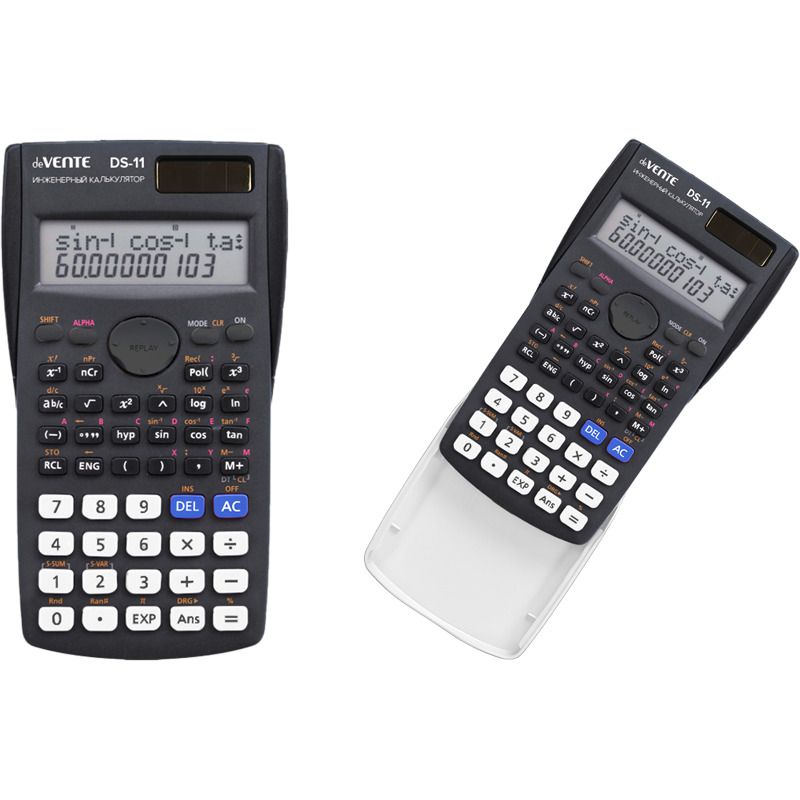 Калькулятор инженерный непрограммируемый "deVENTE" DS-11, 85x155x25 мм, разрешен для ОГЭ, ЕГЭ, 240 функций, 2-строчный полноразмерный дисплей с функцией многократного перерасчета выражений, 10+2 разрядный, вычисление в памяти с 9-ю переменными, действия с дробями, угловые вычисления и преобразования (DEG/RAD/GRA) функция воспроизведения, пермутация и комбинация, статистические операции (редактор статистических данных, среднеквадратичное отклонение, регрессионный анализ) алгебраические, тригонометрические, логарифмические, гиперболические функции, экспанциальные и радикальные выражения, редактирование, автоматическое отключение, цвет черно-белый, в картонной коробке