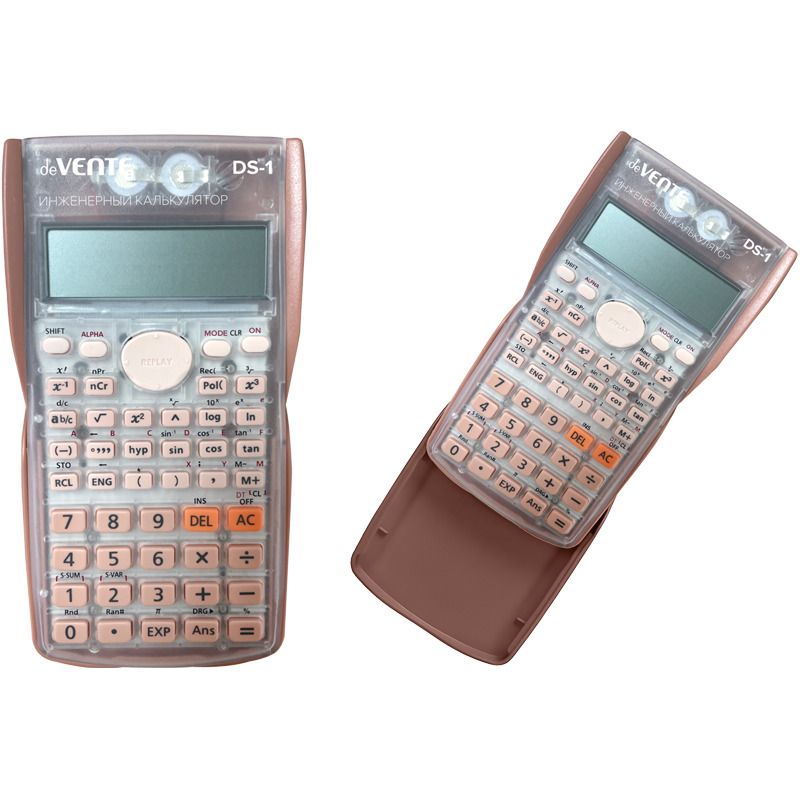 Калькулятор инженерный непрограммируемый "deVENTE" DS-1TP, 85x155x25 мм, разрешен для ОГЭ, ЕГЭ, 240 функций, 2-строчный полноразмерный дисплей с функцией многократного перерасчета выражений, 10+2 разрядный, вычисление в памяти с 9-ю переменными, действия с дробями, угловые вычисления и преобразования (DEG/RAD/GRA) функция воспроизведения, пермутация и комбинация, статистические операции (редактор статистических данных, среднеквадратичное отклонение, регрессионный анализ) алгебраические, тригонометрические, логарифмические, гиперболические функции, экспанциальные и радикальные выражения, редактирование, автоматическое отключение, цвет прозрачный пудровый, в картонной коробке