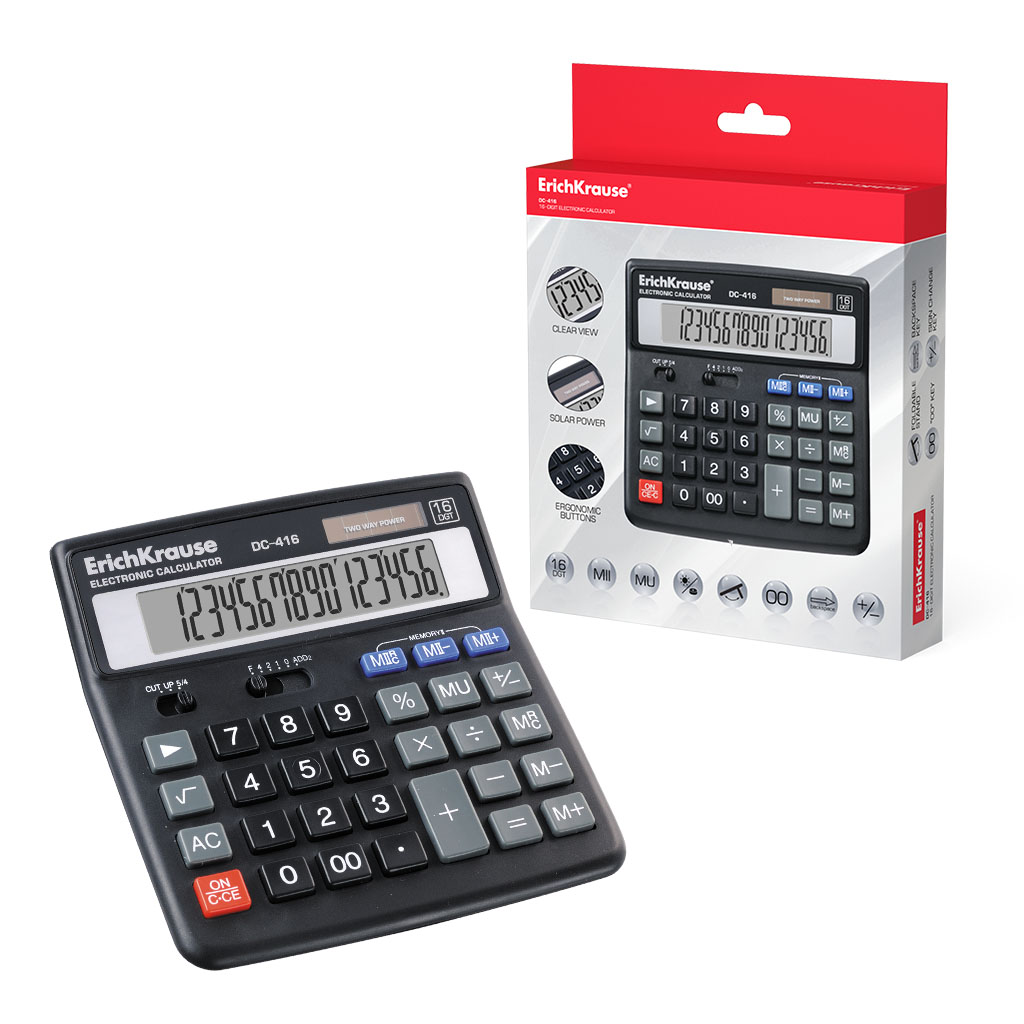 Бухгалтерский калькулятор в пластиковом корпусе с 16-разрядным ЖК - дисплеем с акриловым покрытием. Складная подставка. Имеет двухуровневую память. Оптимальный набор вычислительных функций позволяет совершать основные математические операции, рассчитывать проценты, наценку, извлекать квадратный корень, суммировать произведенные операции и запоминать промежуточный результат. Удобная клавиатура снабжена кнопками двойного нуля и удаления последней отображаемой цифры. Наличие двух переключателей: режима округления и количества знаков после запятой. Для экономии энергии предусмотрены два источника питания: солнечная и алкалиновая батарея, а также функция автоматического выключения.