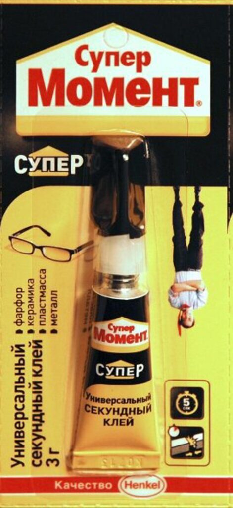 Клей Момент Супер секундный. Однокомпонентный цианакрилатный клей. Предназначен для склеивания в различном сочетании резины, металлов, дерева, фарфора, керамики, кожи, пробки, тканей, картона и бумаги и различный пластмасс. HЕ пригоден для склеивания посуды, контактирующей с пищей и для склеивания тефлона, полиэтилена, полипропилена, стекла, глазированный поверхностей и силиконовой резины, очень мягкой кожи.