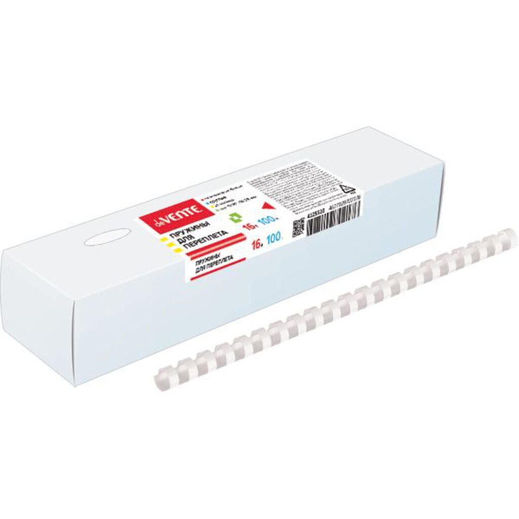 Пружина для переплета "deVENTE" пластик, 16 мм, круглая, белая, 100 шт Пластиковые пружины для переплета применяются для изготовления брошюр, сшивания документов с помощью брошюровочной техники. Позволяют вынимать и добавлять листы в готовый документ. Изготовлены из прочного пластика.