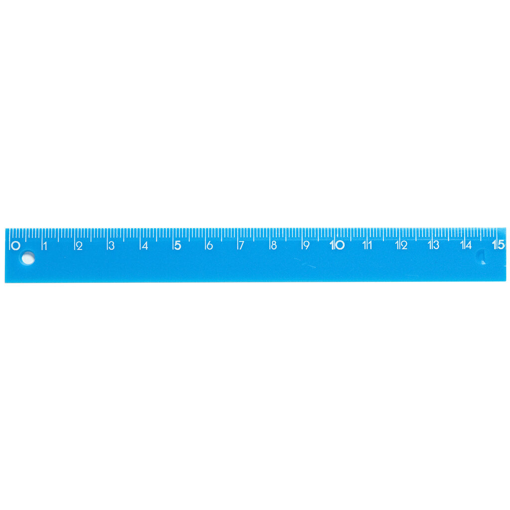 Линейка 15 см с ровной чёткой миллиметровой шкалой. Цветная непрозрачная узкая. Изготовлена из пластика. Штрихкод на единице изделия.