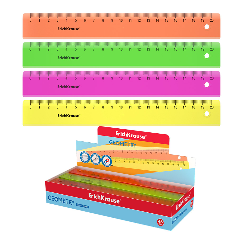 Линейка пластиковая ErichKrause Неон, 20см, ассорти (в коробке-дисплее по 45 шт)