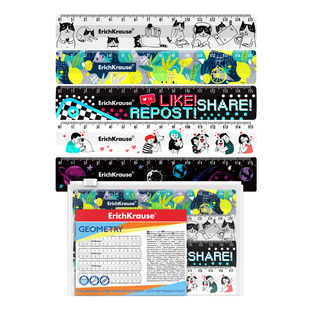 Набор из 4 пластиковых линеек ErichKrause 15см, ассорти из 4 дизайнов, в зиплок-пакете (унисекс)