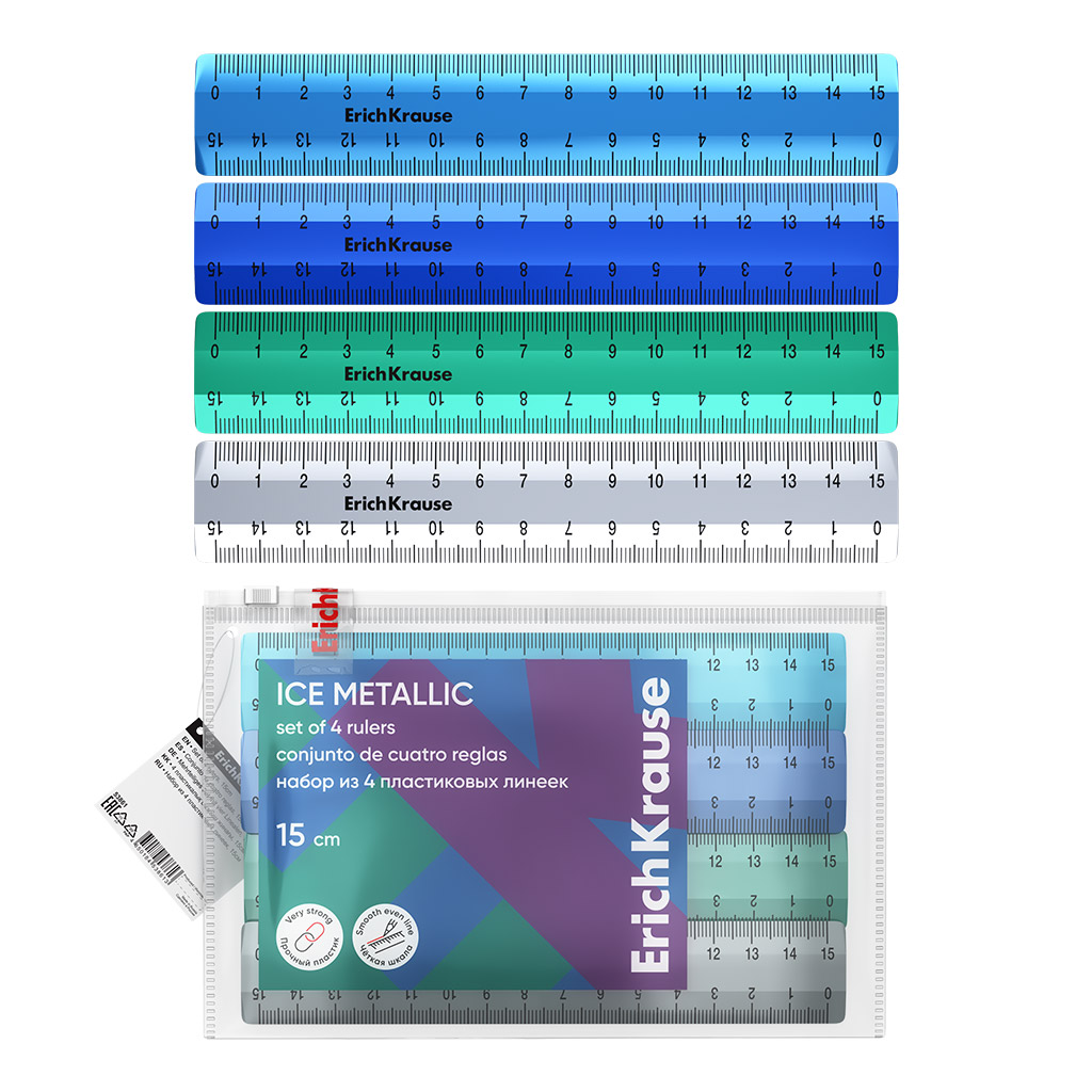 Набор из 4 пластиковых линеек ErichKrause Ледяной металл, 15см, зиплок-пакет, ассорти (в пакете по 20 шт)