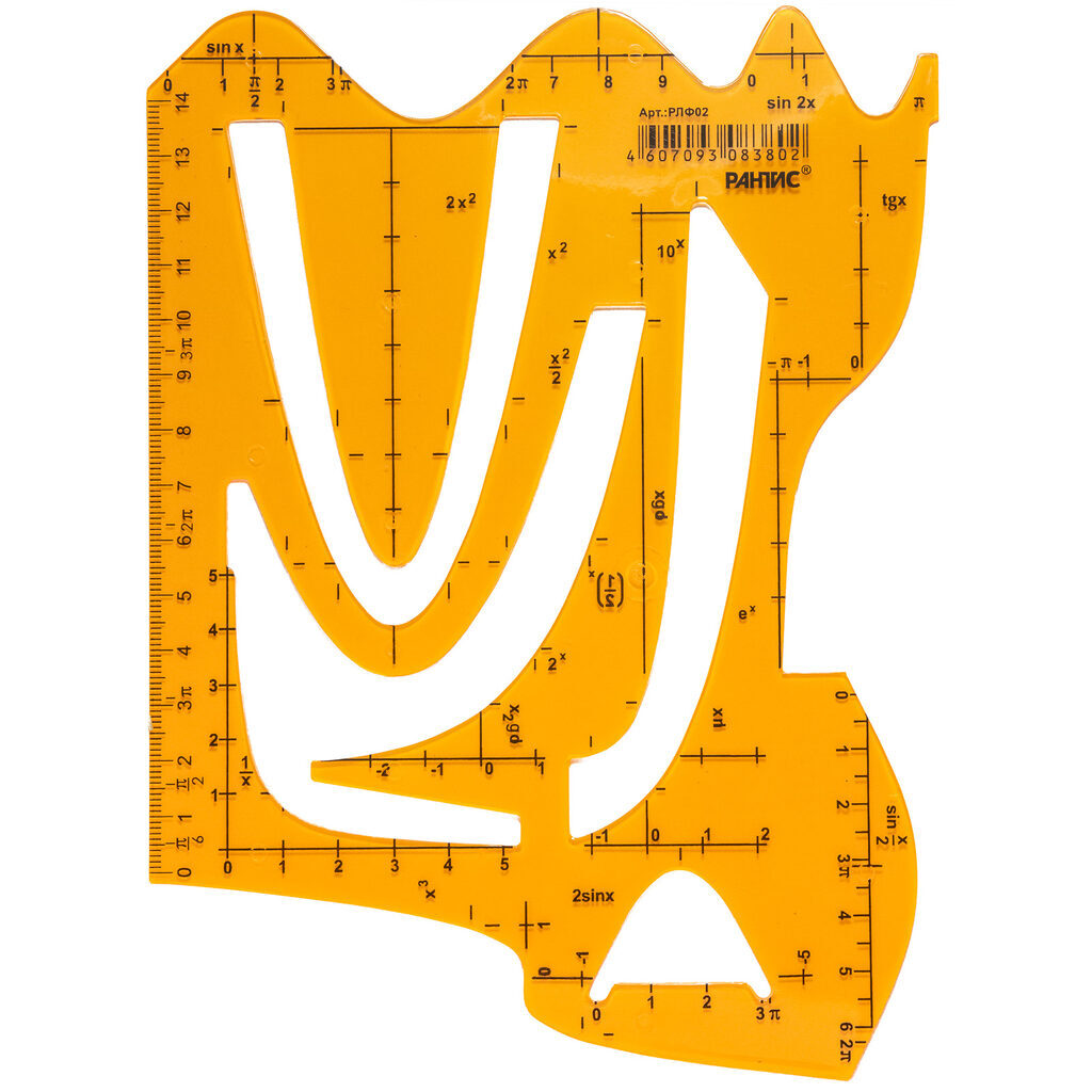 Трафарет позволяет построить 16 видов графиков функций. Содержит линейку 14 см с отливной шкалой. Гладкая полированная поверхность. Цвет: флуорисцентные прозрачные. Индивидуальный штрих-код на единице изделия.