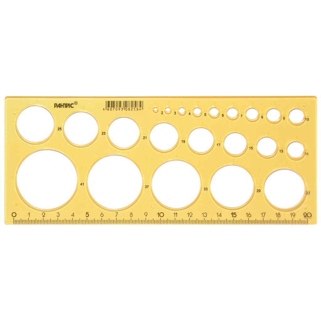 Трафарет содержит 36 видов окружностей диаметром от 1 до 36 мм. Широко используется в черчении, конструировании, на уроках геометрии и графики. Гладкая полированная поверхность. Цвета ассорти. Индивидуальный штрих-код на единице изделия.