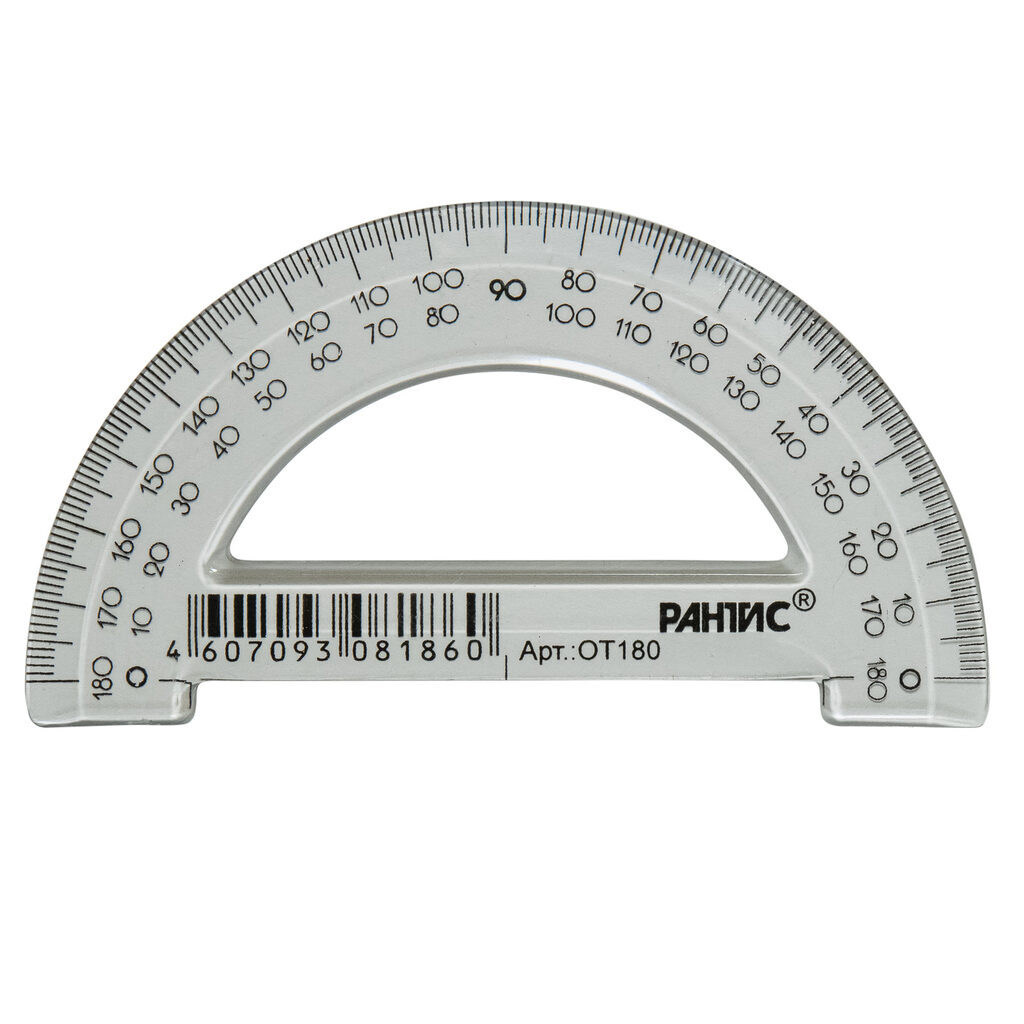 Транспортир 180 градусов, 10см, с чёткой печатной миллиметровой шкалой и фасками Гладкая глянцевая поверхность. Цвет: прозрачный тонированный.. Штрих-код на единице изделия.