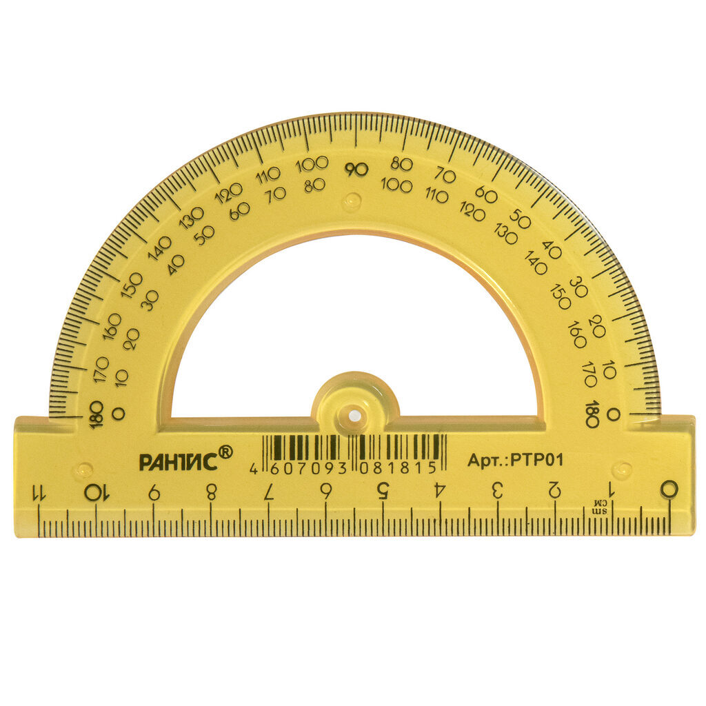 Транспортир 180 градусов, 12см, с чёткой печатной миллиметровой шкалой и фасками. Гладкая глянцевая поверхность. Цвет: 4 ярких цвета ассорти (прозрачные). Штрих-код на единице изделия.
