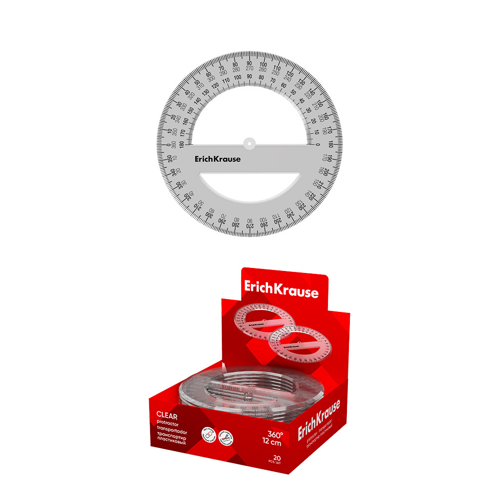 Транспортир пластиковый ErichKrause Прозрачность, 360°/12см, прозрачный (в коробке-дисплее по 20 шт)