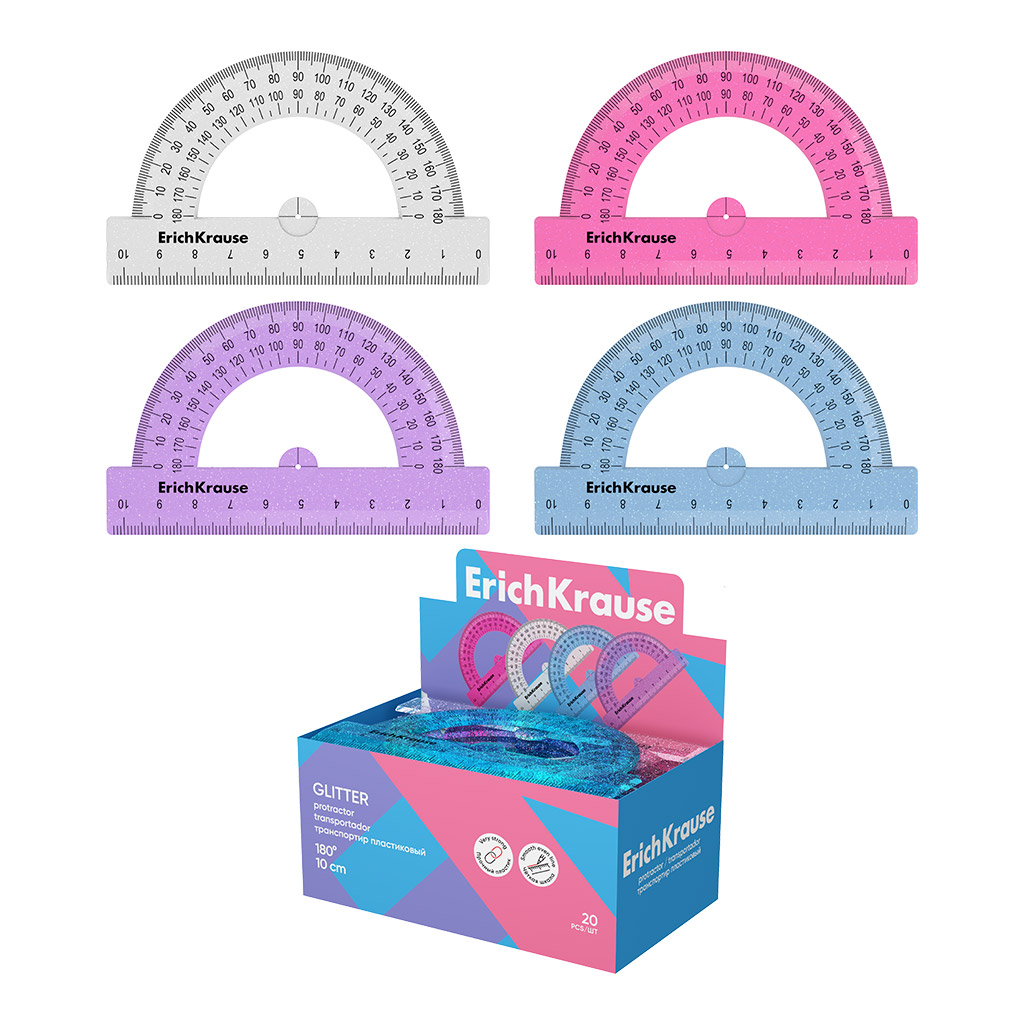 Транспортир пластиковый ErichKrause Блёстки, 180°/10см, ассорти (в коробке-дисплее по 20 шт)