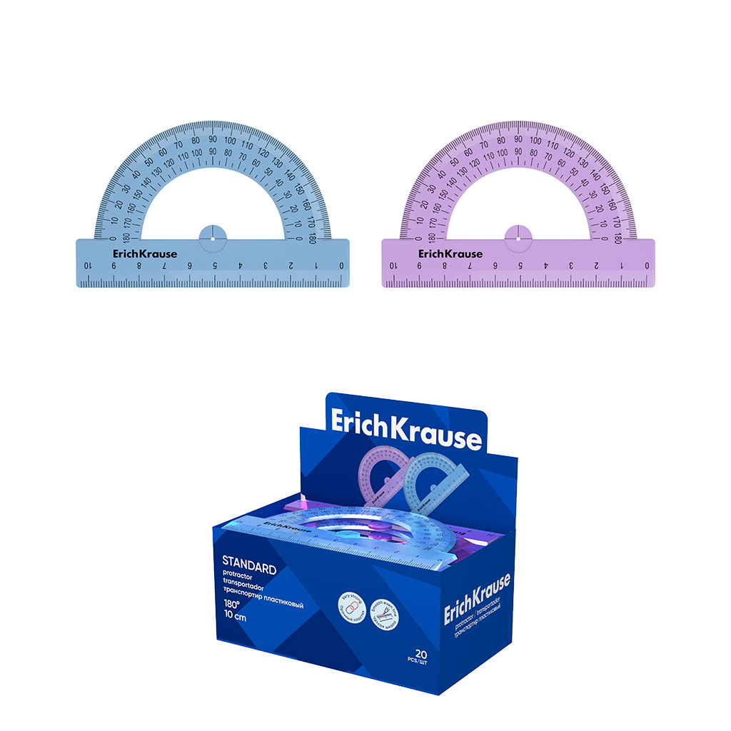 Транспортир пластиковый ErichKrause 180°/10см, ассорти (в коробке-дисплее по 20 шт)
