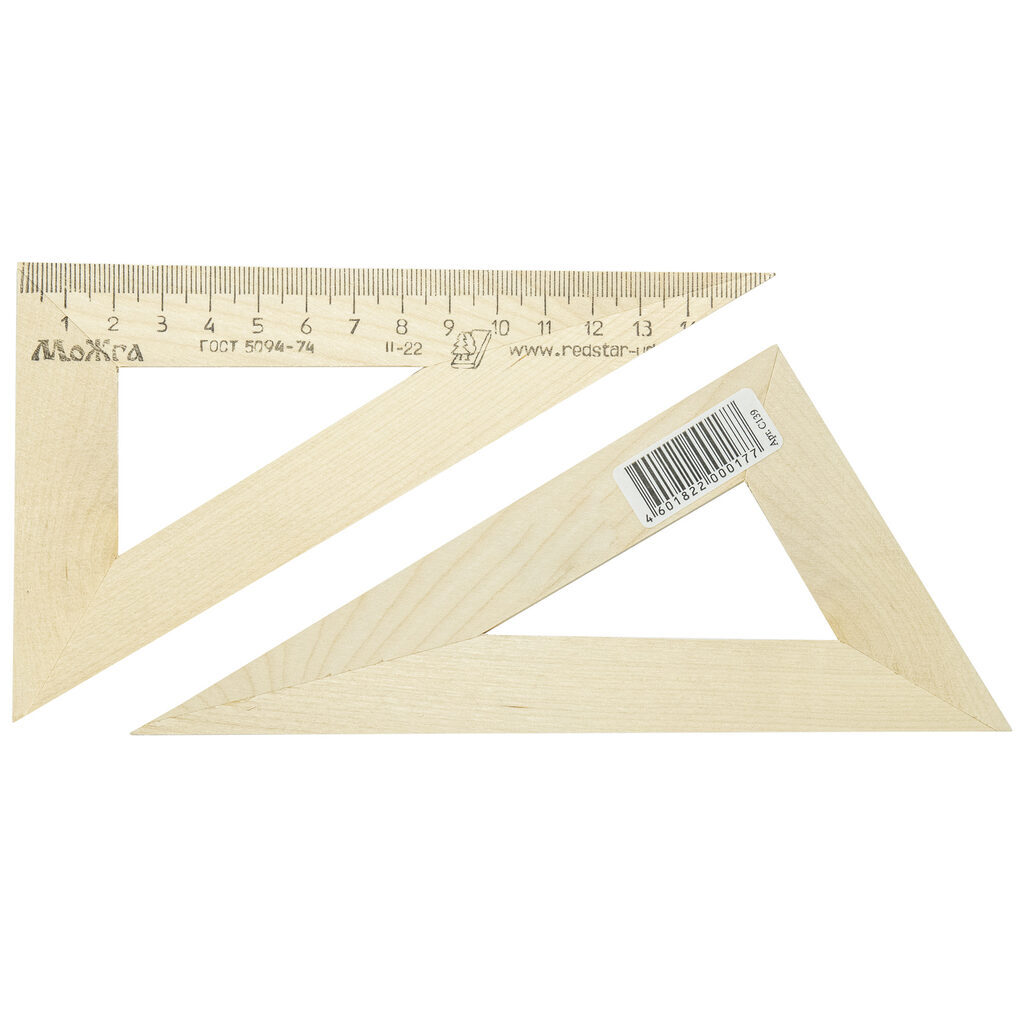 Угольник с прямым углом, 30, и 60, изготовлен из твердолиственных пород древесины, имеют износостойкую одностороннюю шкалу. Длина шкалы 160мм Штрих-код на единице товара.