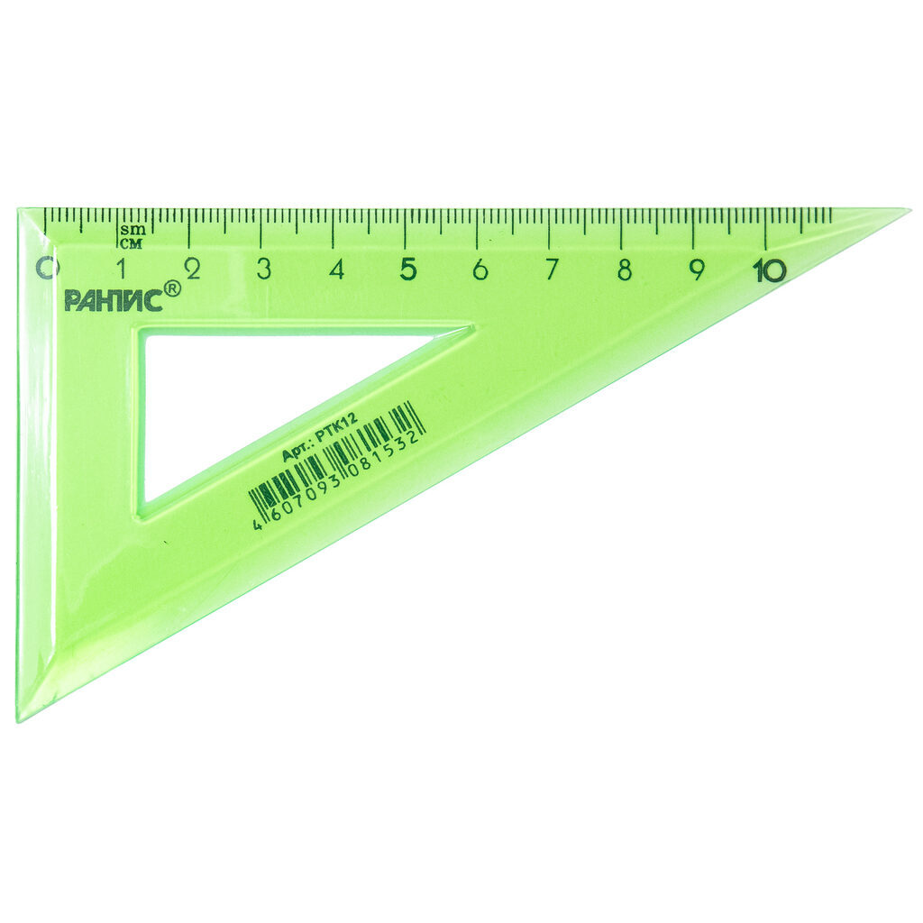 Треугольник 30 градусов 12см с чёткой печатной миллиметровой шкалой. Гладкая глянцевая поверхность. Цвет: 4 ярких цвета ассорти (прозрачные). Штрих-код на единице изделия.