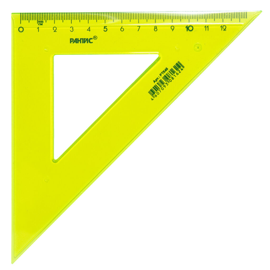 Треугольник 45градусов 14 см с чёткой печатной миллиметровой шкалой. Гладкая глянцевая поверхность. Цвет: 4 ярких цвета ассорти (прозрачные). Штрих-код на единице изделия.