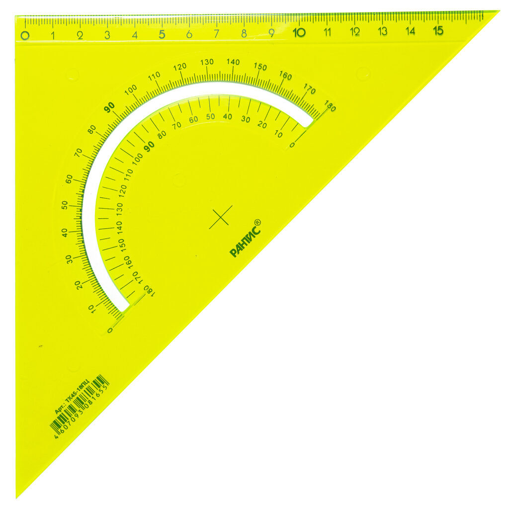 Треугольник 45 градусов 18см с чёткой печатной миллиметровой шкалой и транспортиром. Гладкая глянцевая поверхность. Цвет: прозрачный бесцветный.. Штрих-код на единице изделия.