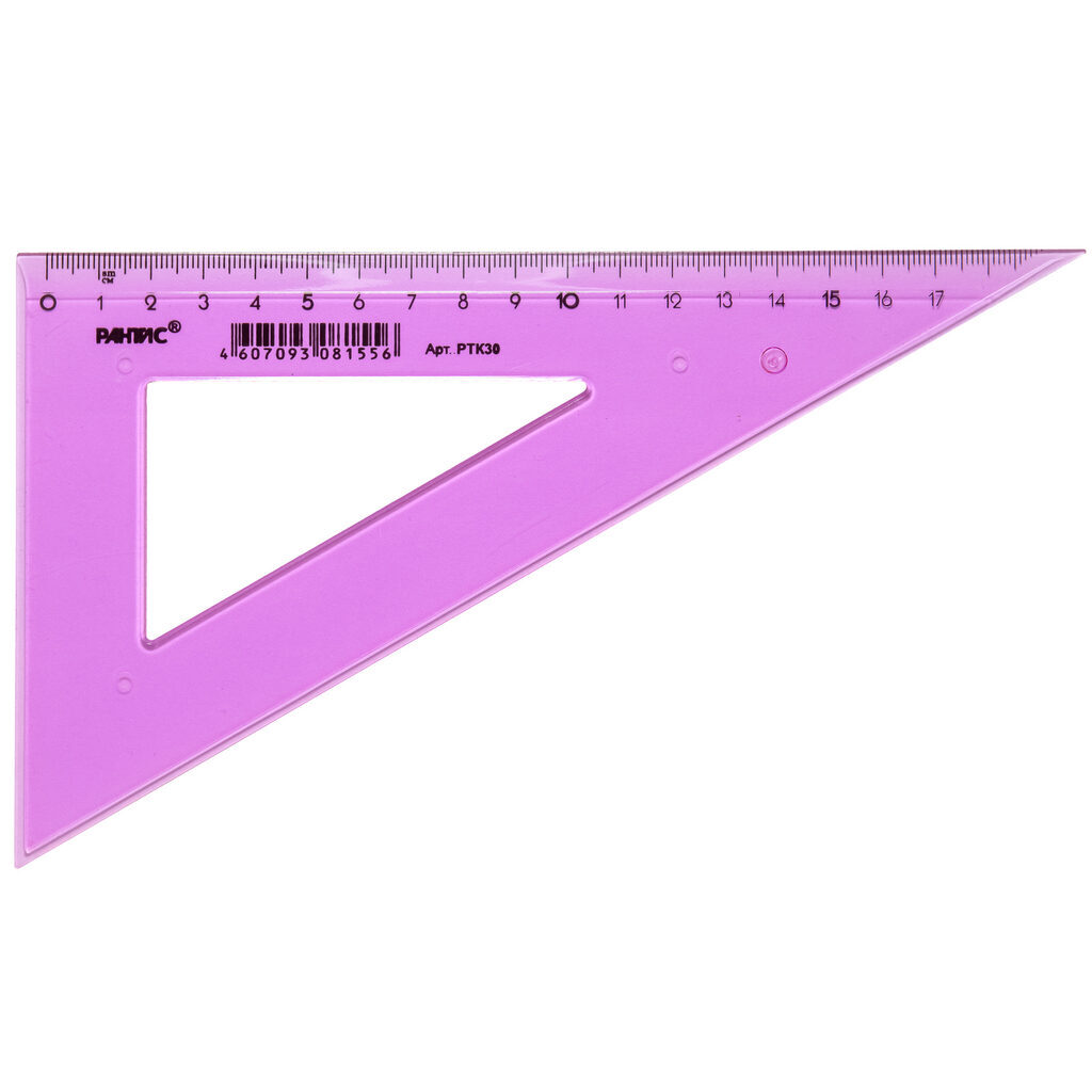Треугольник 30 градусов 20см с чёткой печатной миллиметровой шкалой. Гладкая глянцевая поверхность. Цвет: 4 ярких цвета ассорти (прозрачные). Штрих-код на единице изделия.