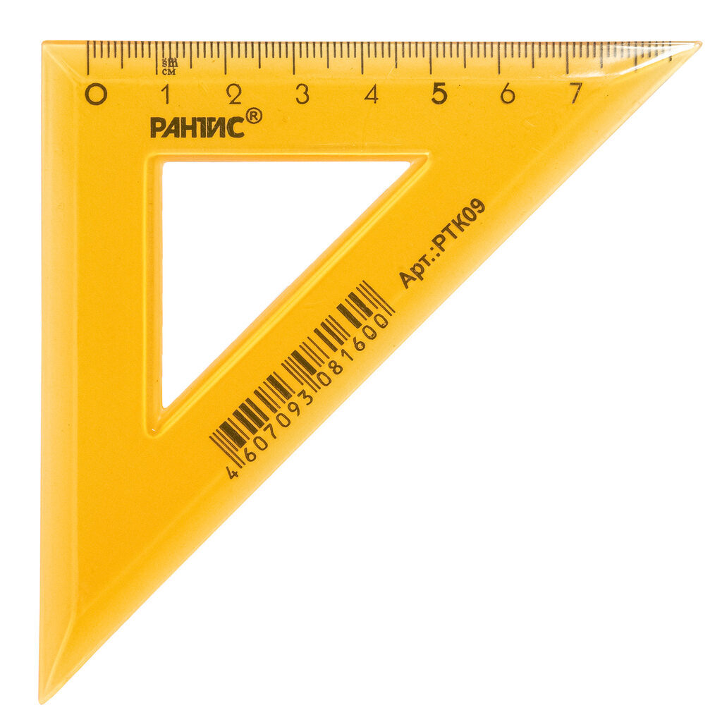Треугольник 45 градусов 9 см с чёткой печатной миллиметровой шкалой. Гладкая глянцевая поверхность. Цвет: 4 ярких цвета ассорти (прозрачные). Штрих-код на единице изделия.