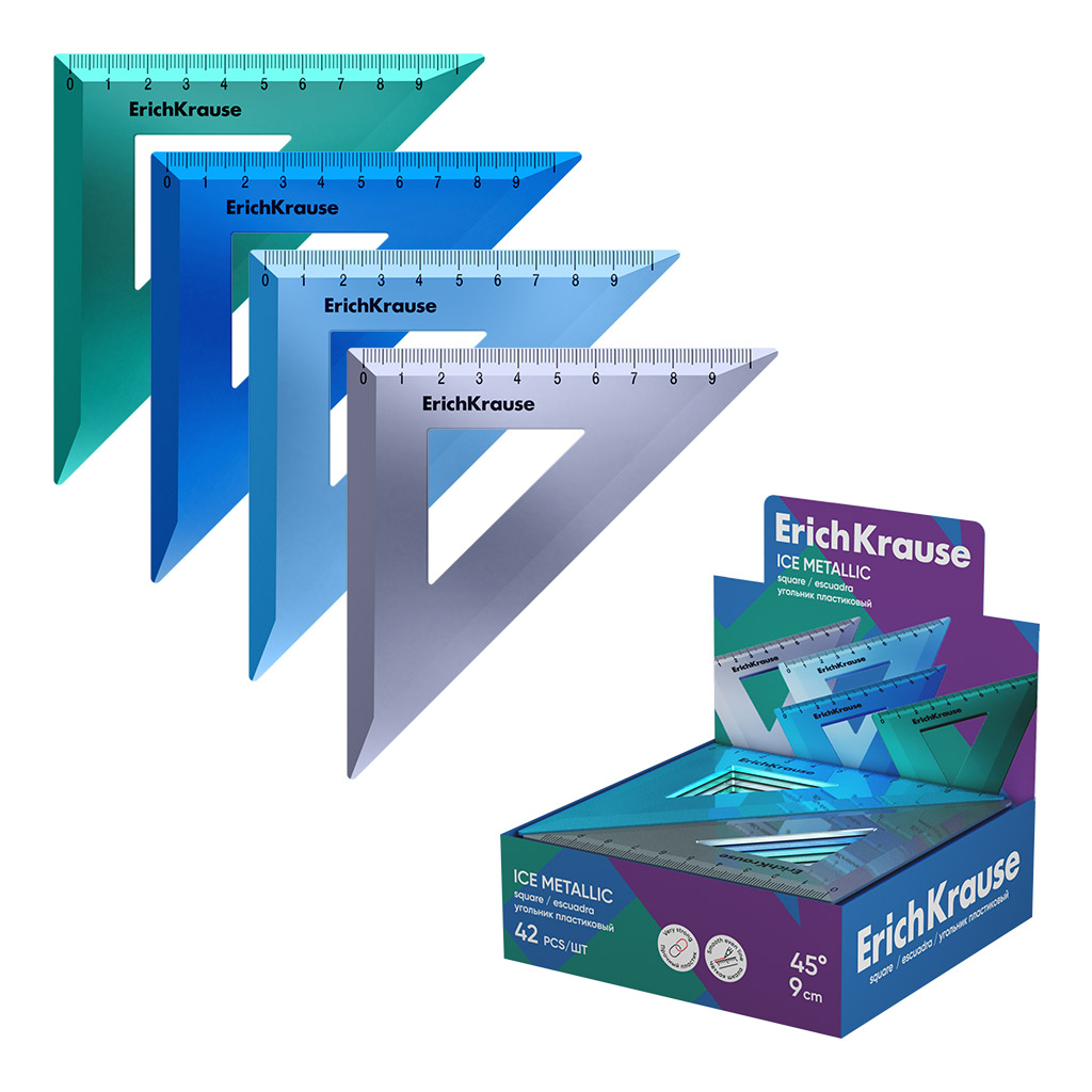 Угольник пластиковый ErichKrause Ледяной металл, 45°/9см, ассорти (в коробке-дисплее по 42 шт)