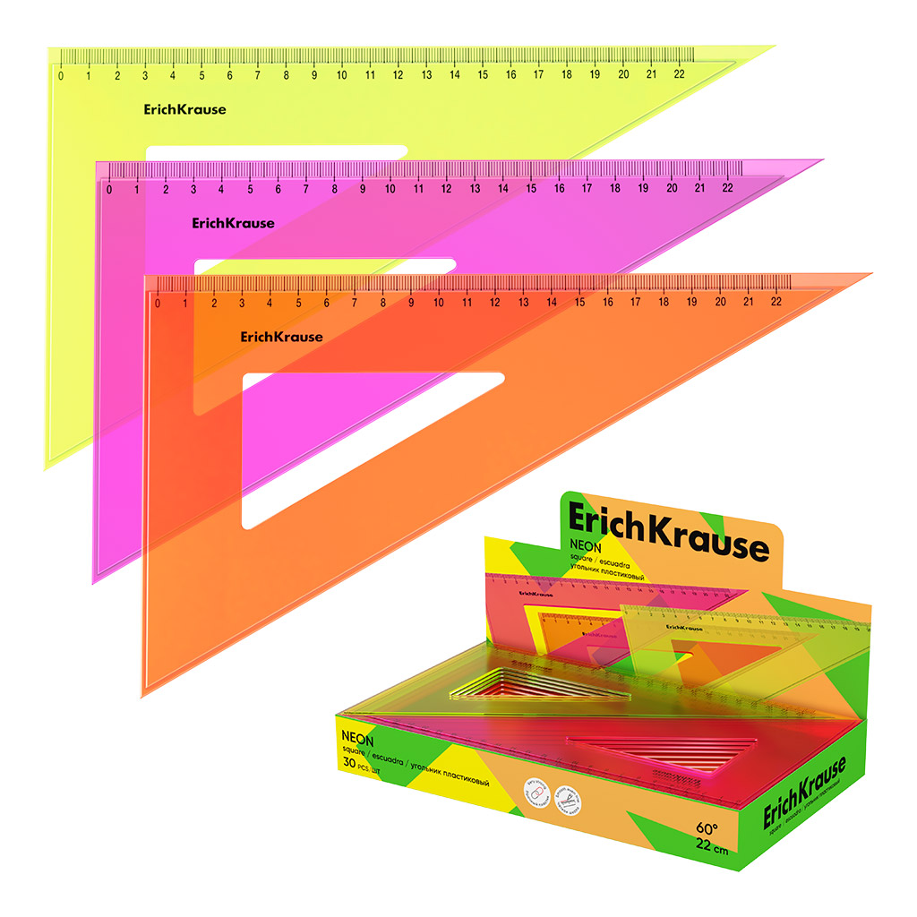 Угольник пластиковый ErichKrause Неон, 60°/22см, ассорти (в коробке-дисплее по 30 шт)