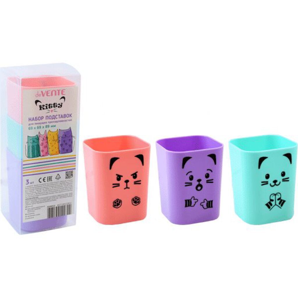 Набор подставок для пишущих принадлежностей "deVENTE. Kitty" 3 пластиковых подставки 6,9x6,9x8,9 см c цветным рисунком, в пластиковой подарочной коробке