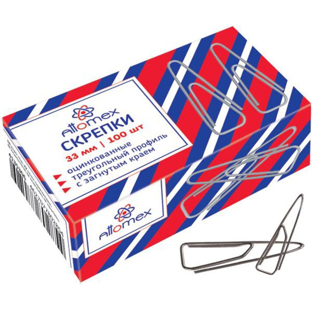 Скрепка канцелярский предмет для скрепления листов бумаги. Скрепки оцинкованные "Attomex", имеют размер 33 мм. Без покрытия. Гладкие, треугольной формы. Надежно скрепляют документы, не деформируют бумагу. Упакованы в картонной коробке по 100 скрепок.