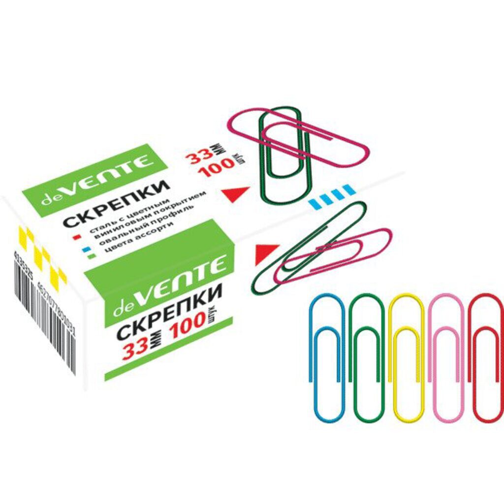 Скрепка канцелярский предмет для скрепления листов бумаги. Скрепки металлические "deVENTE", имеют размер 33 мм. В пластиковой оболочке. Гладкие, овальной формы. Надежно скрепляют документы, не деформируют бумагу. Упакованы в картонной коробке по 100 скрепок.