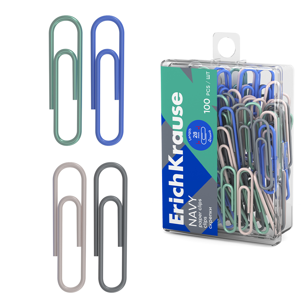 Скрепки металлические с виниловым покрытием ErichKrause Морской шторм, 28 мм, ассорти (в пластиковой коробке по 100 шт.)