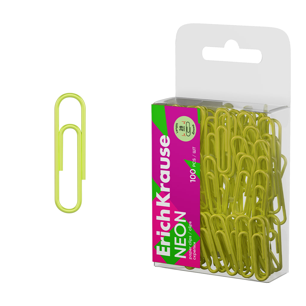 Скрепки металлические с виниловым покрытием ErichKrause Неон, 28 мм, желтый (в ПЭТ-боксе по 100 шт.)