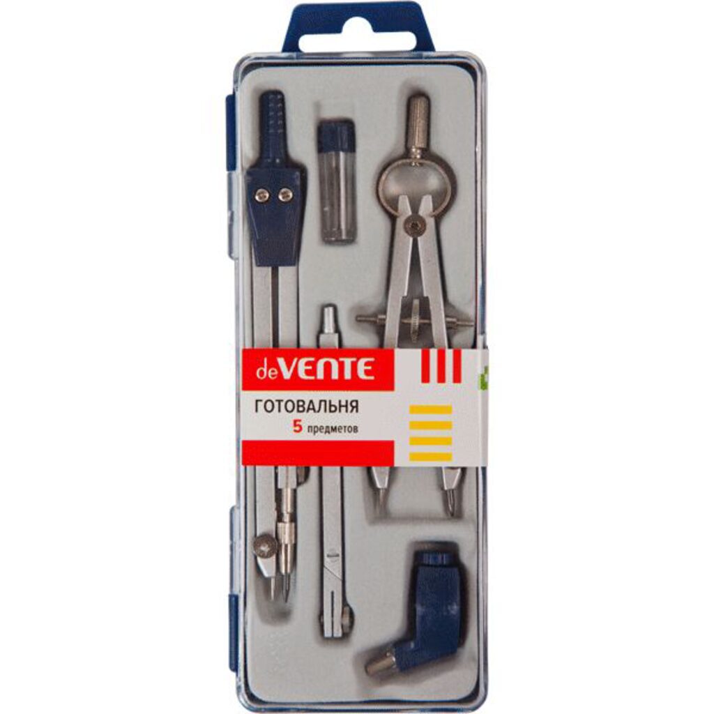 Готовальня deVENTE 5 предметов в пластиковом футляре В набор входит: циркуль, малый кронциркуль, удлинитель, насадка с универсальным держателем, грифель в пенале. Материал: цинк, длина циркуля: 14 см, макс. диаметр круга: 36 см, диаметр штифта: 3,5 мм. Цвет пластика: темно-синий