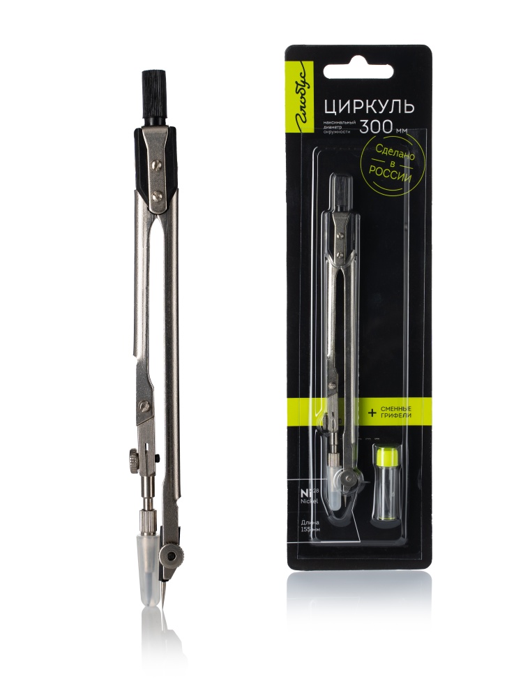 В наборе 2 предмета: Циркуль стальной, никелированный, латунная карандашная вставка, для старших классов и студентов, пенал с запасным грифелем. Длина 155 мм, максимальный диаметр окружности - 300 мм. Упаковка: блистер, европодвес.