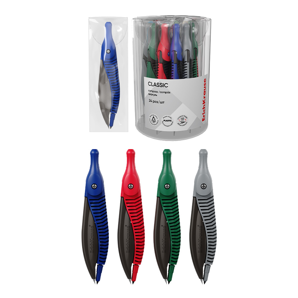 Циркуль пластиковый ErichKrause Классика, 122мм, ПВХ чехол, ассорти (в тубусе по 24 шт)