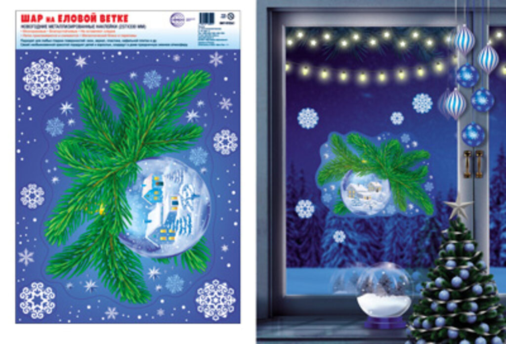 Витражная наклейка 33*23см "Шар на еловой ветке" серебро, металлизация
