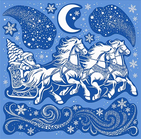 Витражная наклейка 33*33см "Дед Мороз на тройке лошадей" пластизоль