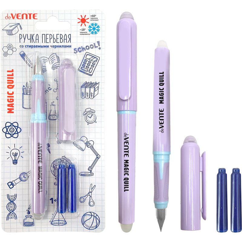Ручка перьевая стираемая "deVENTE. Magic Quill" перо среднее F (Fine) с каучуковым держателем, в комплекте с 3-мя баллончиками 0,8 мл (1 - в ручке, 2 - запасных), сиреневый корпус, синий цвет чернил, блистерная упаковка