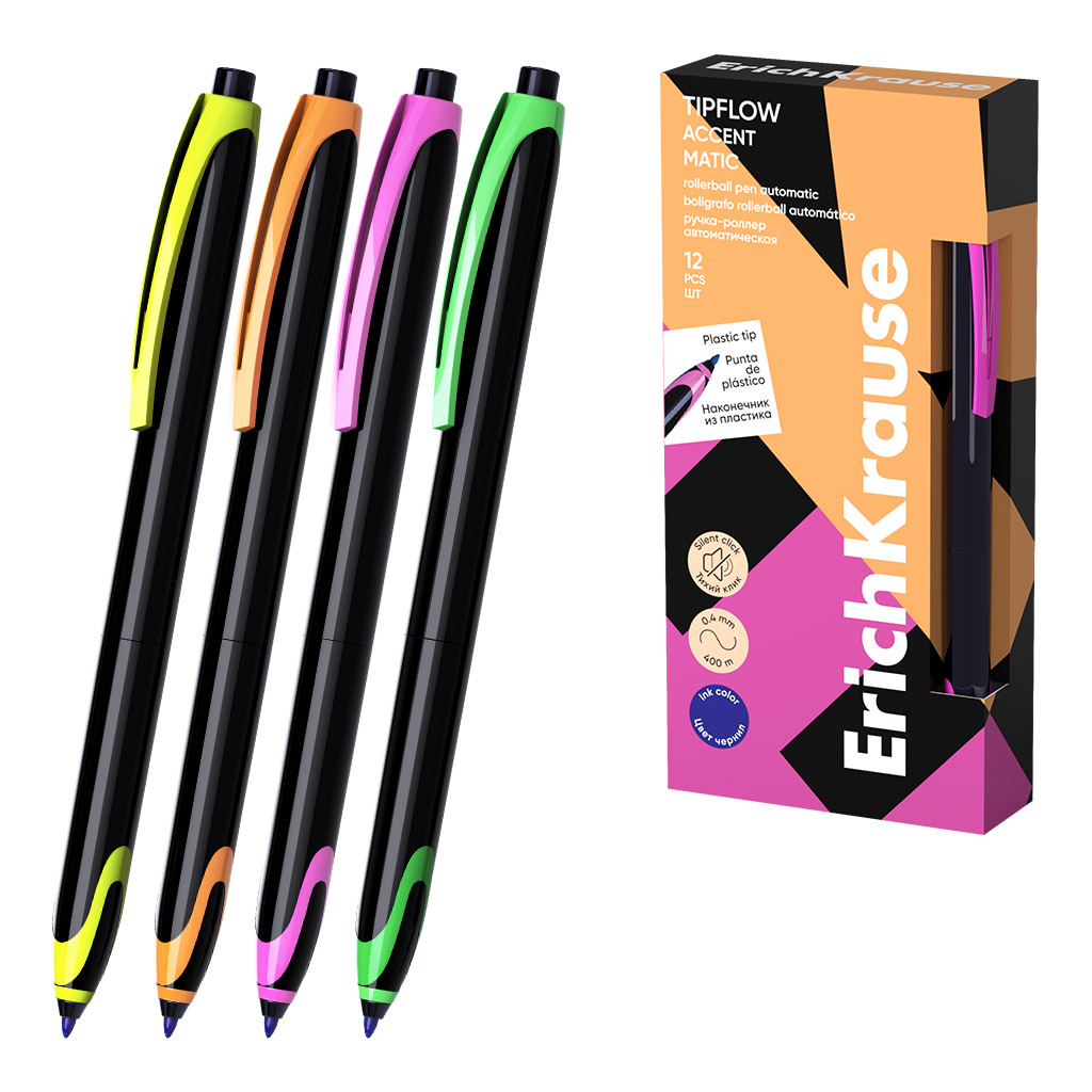 Ручка-роллер автоматическая бесшумная ErichKrause Акцент 0.5, с пласт. наконечником, цвет чернил синий (в коробке по 12 шт.)