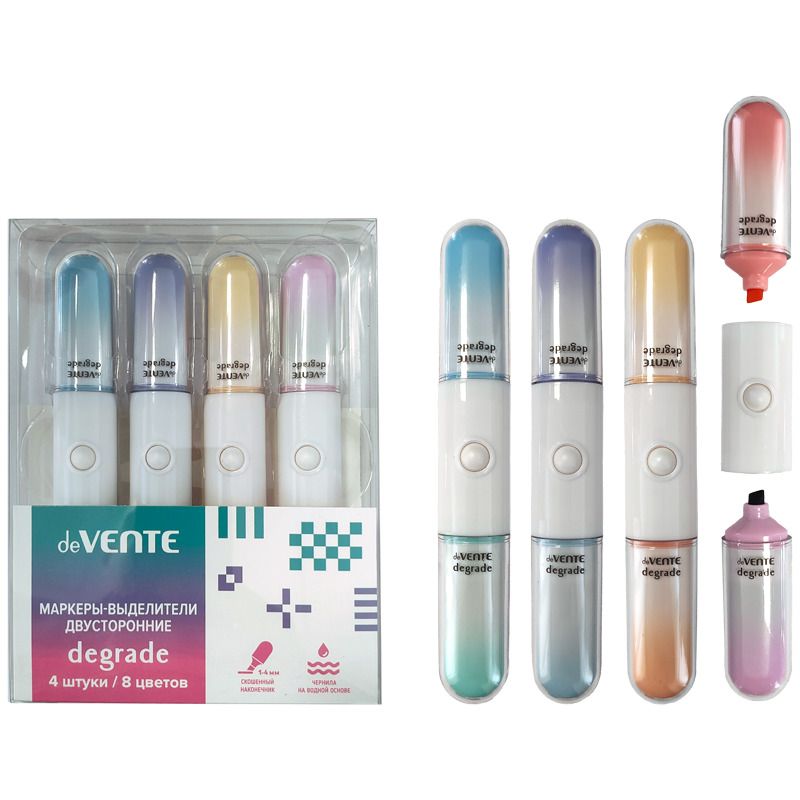 Набор маркеров-выделителей "deVENTE. Degrade" двусторонние, 4 шт / 8 цветов (фиол./т-гол., св-гол/зел., корал/персик., роз/сирен.) плоский корпус c клипом, скошенный наконечник, ширина линии 1-4 мм, в пластиковой коробке