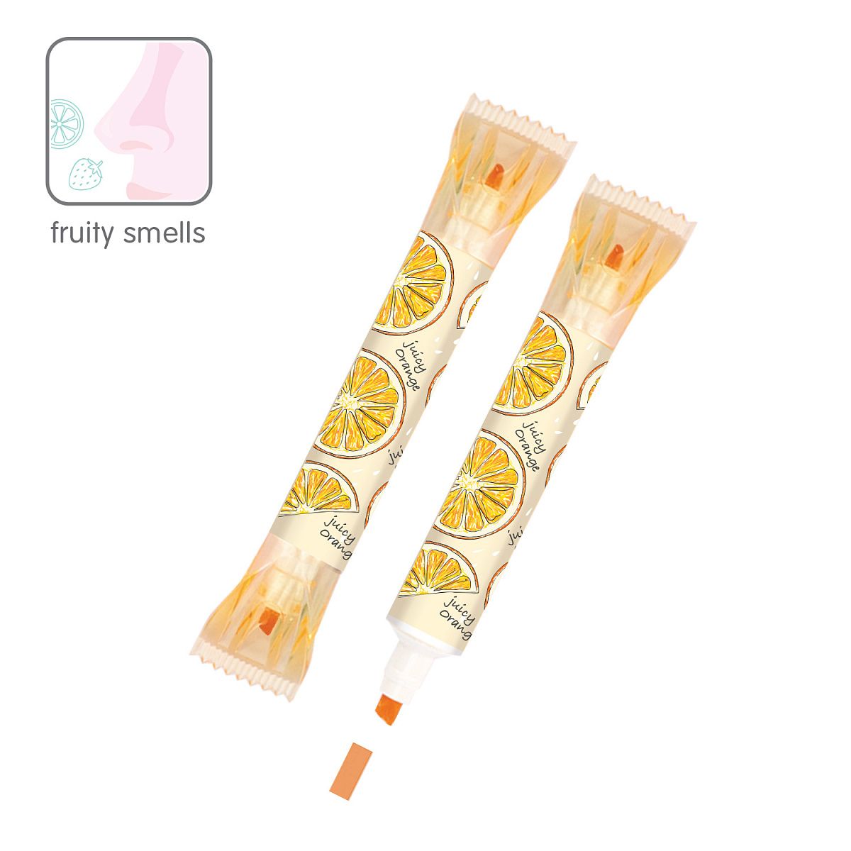 Текстовыделитель с запахом BrunoVisconti "TUTTI FRUTTI", оранжевый Арт. 22-0144 Оригинальный дизайн текстовыделителя TUTTI FRUTTI и его приятный фруктовый аромат не оставят никого равнодушным. Два вида наконечника пулевидный и скошенный, позволяют варьировать ширину линии от 1 до 5 мм. Чернила на водной основе оставляют яркий след.