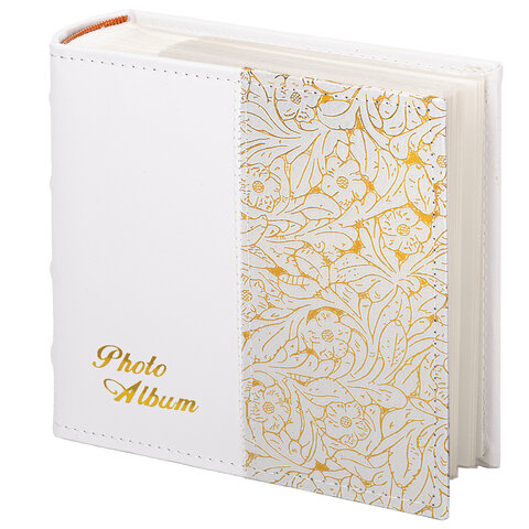 Состоит из 75 бумажных листов размером 15,5х21 см с карманами и вмещает 300 фотографий размером 10х15 см, по 2 штуки на странице. Обложка фотоальбома скомбинирована из материалов под гладкую и фактурную кожу белого и золотистого цвета. Фотоальбом с книжным переплетом отличается повышенной прочностью и долгим сроком службы. Имеются поля для подписей. Размер - 20,7х21,8 см.