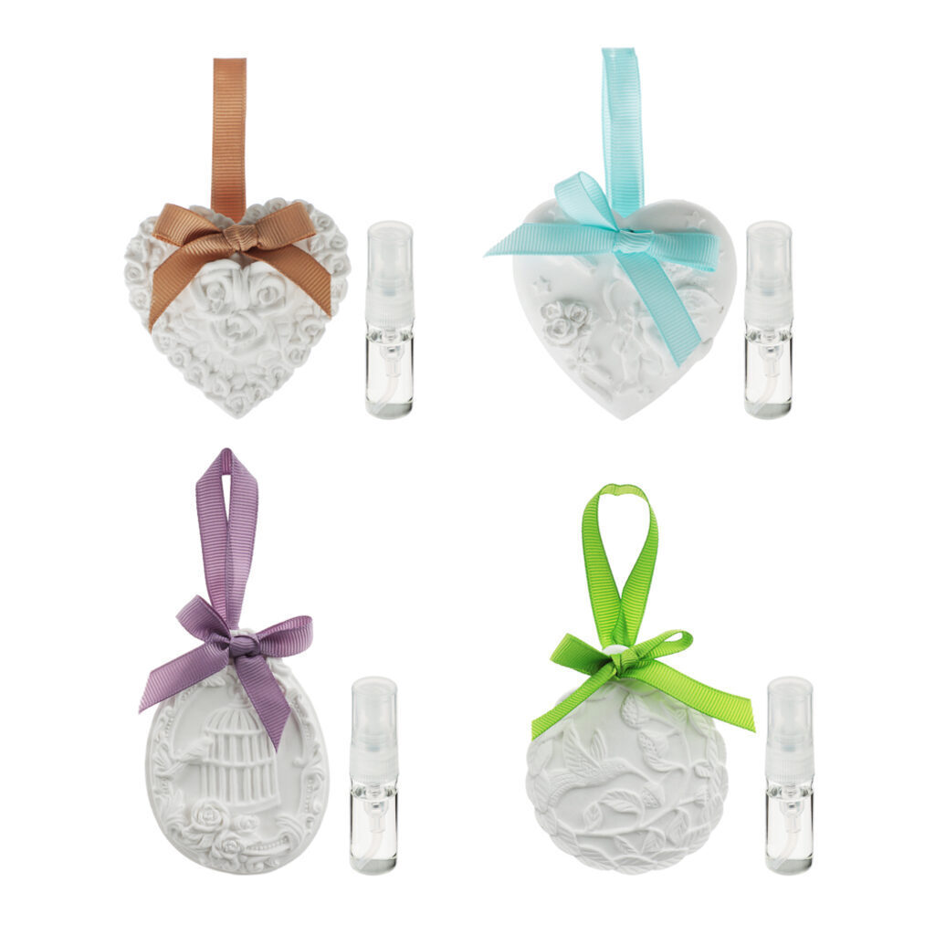 Ароматический набор  включает аромамасло с дозатором-распылителем и декоративную гипсовую фигурку с петелькой для подвешивания в подарочной упаковке. Привлекательная фигурка станет дополнением интерьера помещения и используется как проводник аромата. Для ароматизации помещения достаточно распылить аромамасло на фигурку и повесить ее в любом удобном месте, включая гардеробную и ванну. Нежный аромат эффективно маскирует нежелательные запахи и наполняет помещение приятным благоуханием. Набор может стать приятным подарком на любой праздник. 4 вида на выбор: лаванда, зеленый чай, ваниль, хлопок.