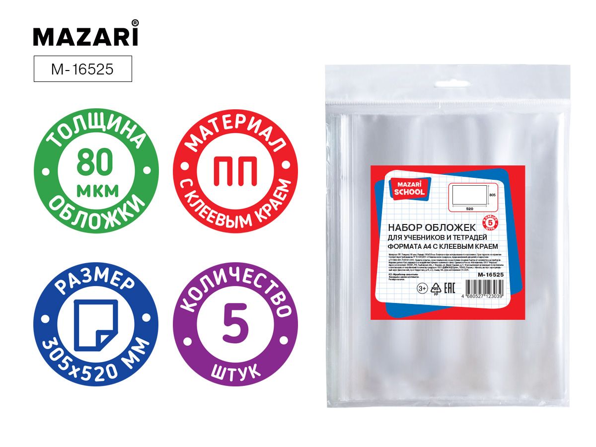 Набор обложек для учебников и тетрадей А4 (310*520) ПП 80мкм прозр. ЛИПКИЙ слой 5шт/уп.