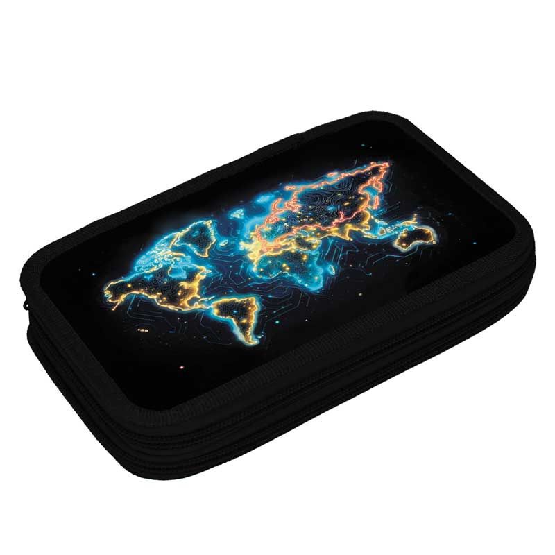Пенал 3 отд. (205*125*55) молния, лам.картон "Карта мира" с эффектом МЕТАЛЛ