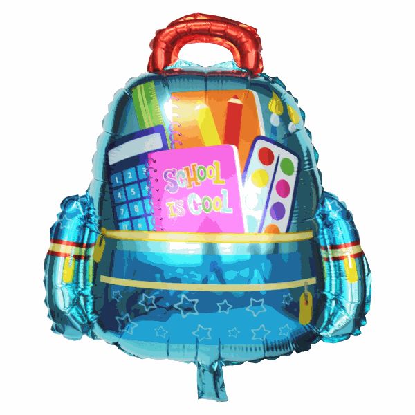 Сложная, объемная фигура в форме забавного школьного рюкзака с надписью School is cool (Школа - это круто). Рекомендуется наполнять гелием. Имеет встроенный клапан - что упрощает надувание. Тонкая миларовая (фольга на полиэтиленовой основе) пленка позволяет шарам не сдуваться от недели до одного месяца. Упакован в красочный пакет, с цветным изображением шара, что позволяет выставлять товар в ненадутом виде.