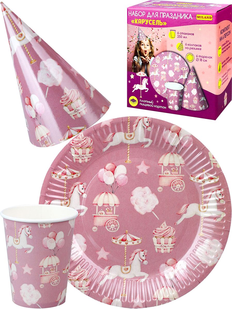 Набор для праздника "Карусель" тарелка 6 шт, стаканы 6 шт, колпаки 6 шт