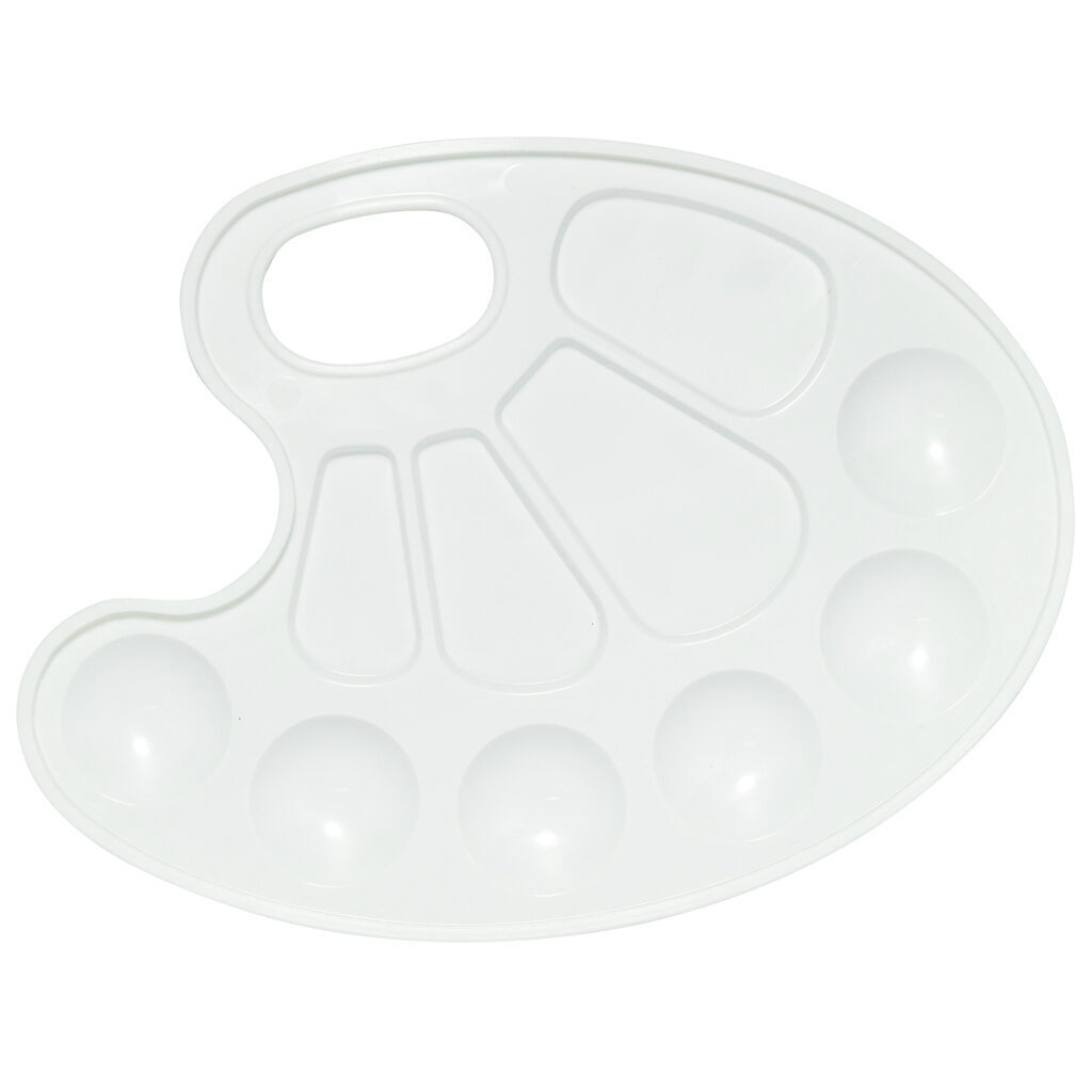 Палитра классическая пластиковая овальная с 6 кюветов и 4 ячейки различной формы для смешивания красок.