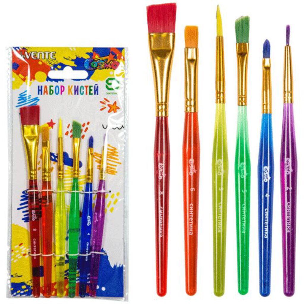 Набор кистей "deVENTE. Cosmo" 6 шт (синтетика круглые  2, 3, 4, плоские  5, 6, 8) ручка пластиковая, окрас волоса и ручки в ярких цветах, в пластиковой упаковке с картонной подложкой и