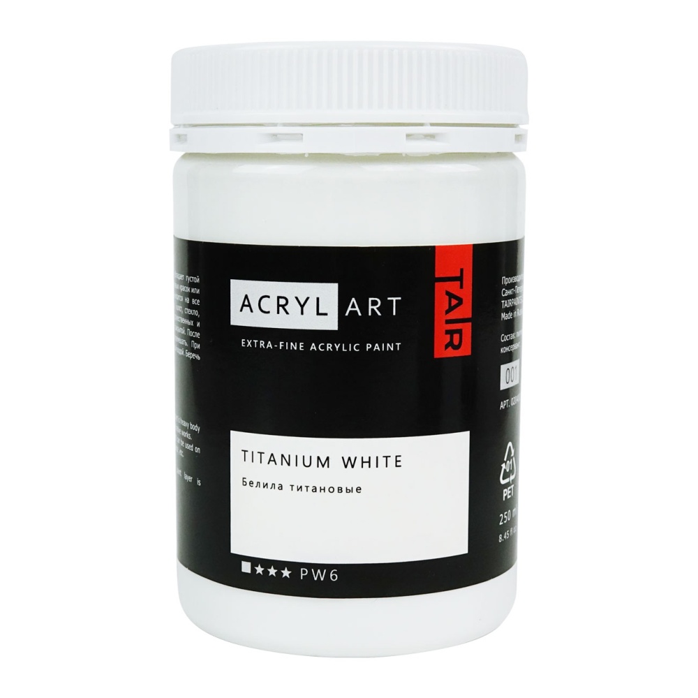 Водоразбавляемые, вязкотекучие, мягкие кроющие живописные акриловые краски на основе дисперсии акриловых и синтетических смол не содержат вредных веществ и пигментов с тяжёлыми металлами.  Акриловые краски производства фирмы ТАИР имеют слабый запах, устойчивы к атмосферным воздействиям, не желтеют и не стареют, не сморщиваются и не образуют трещин, смешиваются между собой в любых соотношениях, имеют яркие насыщенные тона, высыхают путём испарения воды, приобретая водостойкость.