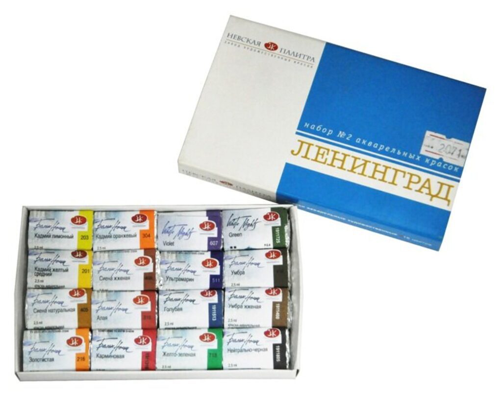 Профессиональные акварельные краски, являются его визитной карточкой завода "Невская палитра" и признаны на международном уровне. Акварельные краски объединены в серии "Белые ночи", "Ладога", "Сонет". В этих красках сохранены традиционные рецептуры с использованием современных производственных технологий. Сегодня акварельная палитра Завода для живописи насчитывает 56 цветов. Акварельная краска серии "Белые ночи" обладает высокой концентрацией цветового тона, сохраняющейся даже при разбавлении большим количеством воды, что обеспечивается высокой концентрацией пигмента и тонкостью его перетира. Краски превосходно смешиваются, прекрасно размываются и разносятся. Акварельная художественная краска серии "Белые ночи" представлена в наборах "Ленинград" по 16 и 24 цвета, в наборах "Санкт-Петербург" из 24 цветов и наборах "Белые ночи" из 12, 24 и 36 цветов. Художественные акварельные краски серии "Ладога" изготовлены на основе высококачественных пигментов и связующих, обеспечивающих основные свойства акварельных кра