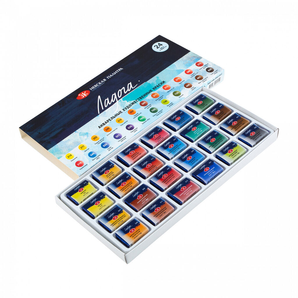 Художественные акварельные краски Ладога разработаны для решения творческих задач учащихся профессиональных образовательных учреждений. Рекомендованы для создания этюдов, эскизов, учебных работ. Краски Ладога выпускаются с применением синтетических пигментов и гуммиарабика. Цвета в наборе: лимонная, желтая, кадмий желтый темный (А), золотисто-желтая, охра желтая, кадмий оранжевый (А), английская красная, шахназарская красная, киноварь (А), ярко-алая, кадмий пурпурный (А), краплак красный светлый, карминовая, ярко-голубая ФЦ, синяя светлая, ультрамарин светлый, персидская синяя, зеленая ФЦ, кобальт зеленый темный (А), весенняя зеленая, зеленая, умбра жженая, марс коричневый темный, сажа газовая теплая