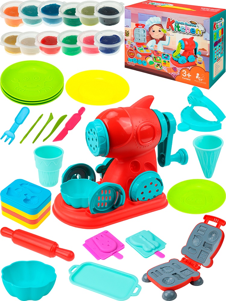 Большой подарочный набор из пластилина прекрасно подойдет для всех детей - мальчиков и девочек от 3-х лет. Игровой набор окунет ребенка в ролевую игру повара на кухне - с помощью мясорубки, гриля и форм он будет "готовить" самые разные блюда, а тесто для лепки, которое заменяет пластилин, идеально подойдет для этого. В наборе: пластилин (12 цветов), 35 предметов. В картонной коробке.
